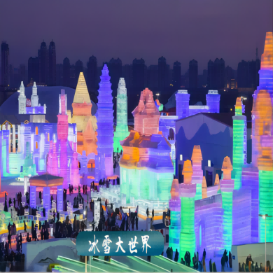 游览【哈尔滨冰雪大世界】,冰雪大世界集冰雪艺术、冰雪文化、冰雪演艺、冰雪建筑、冰雪体育于一体的世界最大的冰雪主题乐园。每年12月下旬至次年3月初开展:晶莹剔透的冰雕作品、洁白如玉的雪雕作品、幻彩炫目的灯光特效、流光溢彩的视觉盛宴,惊险刺激的冰上芭蕾,丰富多彩的冰雪运动在这里轮番登场。其中主塔“冰雪之冠”位于园区恢弘的主轴线上,是整个园区的灵魂。“冰雪之冠”高43米,相当于16层楼高,用冰量1.3万立方米,是园区内最高、单体最大的冰塑景观。
